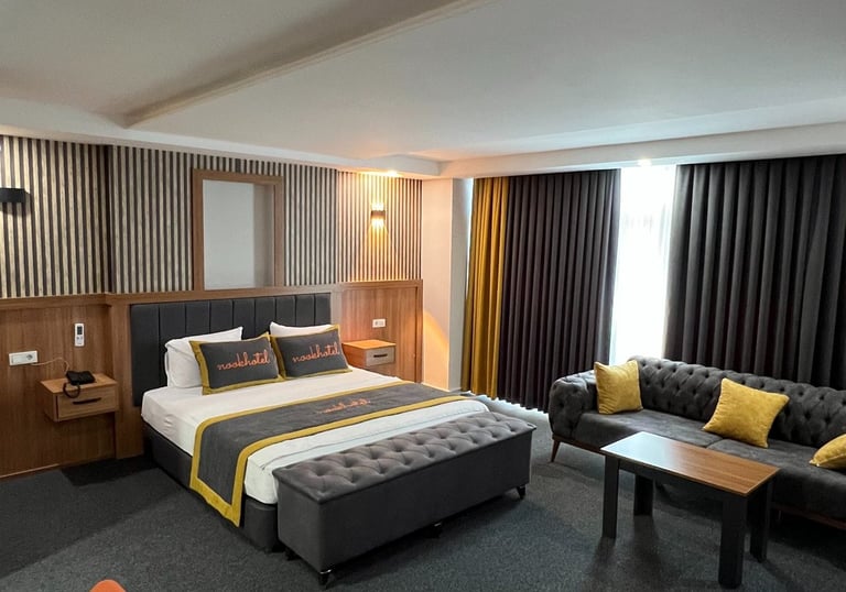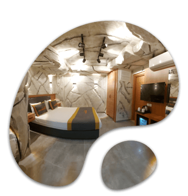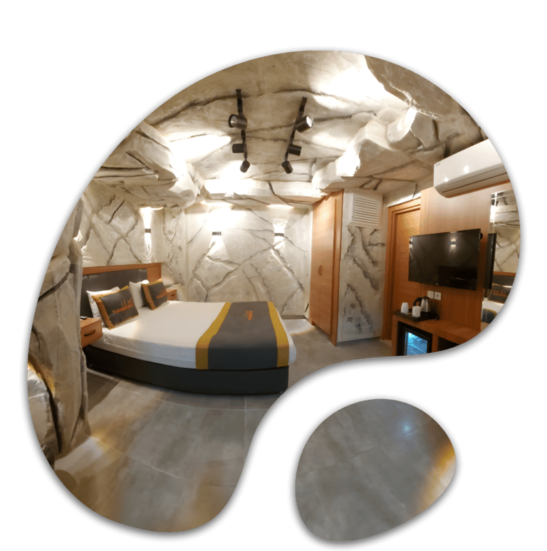 “ Nook Hotel’in özel mağara odası, doğal taş dokusunun sıcaklığıyla modern konforu bir araya getirerek eşsiz bir atmosfer sunar. Gürültüden uzak, huzur dolu bu özel konsept oda; nefes alan duvarları, loş ambiyansı ve sıcak ışık tasarımıyla kendinizi bambaşka bir dünyada hissettirir. Hem romantik konaklamalar hem de farklı bir deneyim arayan misafirler için mükemmel bir tercih. Bu odada geçireceğiniz her an, Mersin’de unutulmaz bir konaklama olarak hafızanıza kazınır ”